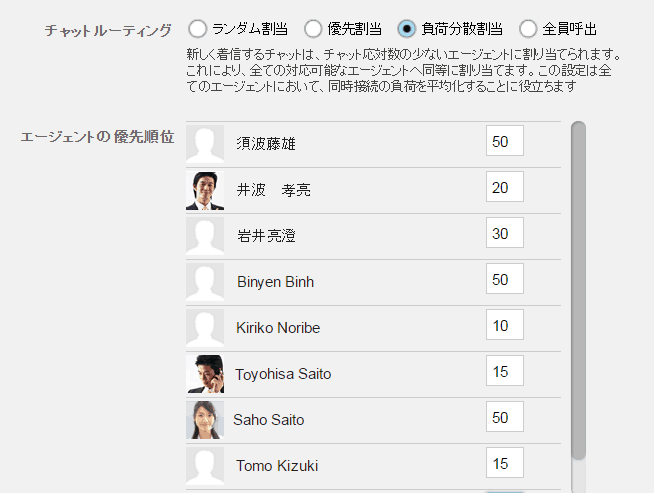 新しく着信するチャットは、チャット応対数の少ないエージェントに割り当てられます。これにより、全ての対応可能なエージェントへ同等に割り当てます。 この設定は全てのエージェントにおいて、同時接続の負荷を平均化することに役立ちます。